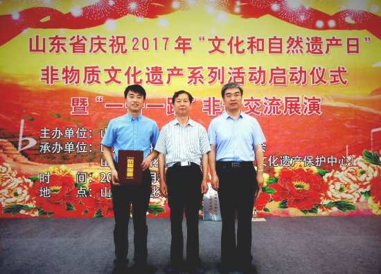 6月8日上午,濟(jì)南舉行了山東省慶祝2017年“文化和自然遺產(chǎn)日”非物質(zhì)文化遺產(chǎn)系列活動(dòng)啟動(dòng)儀式。啟動(dòng)儀式除了豐富多彩的非遺表演之外,還為“山東省非物質(zhì)文化遺產(chǎn)傳承人群研修研習(xí)培訓(xùn)基地”代表、“縣及縣以下歷史文化展示‘十百千’建設(shè)工程示范點(diǎn)”代表、“山東省省級(jí)古籍修復(fù)站點(diǎn)”頒牌;為“2016年度山東省非遺保護(hù)十大亮點(diǎn)工作”、“2016年度山東省非遺保護(hù)十大模范傳承人”頒發(fā)證書(shū)。