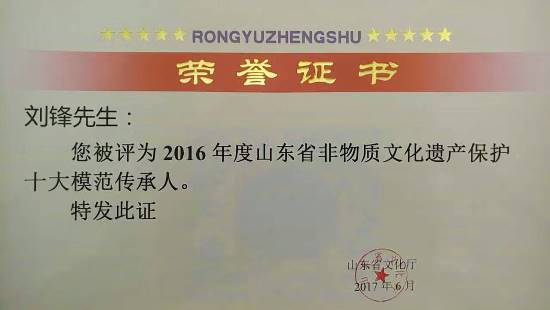 “山東老字號(hào)”山東萊蕪泰順齋食品有限公司掌門人、“口鎮(zhèn)南腸”傳統(tǒng)制作技藝的第六代省級(jí)代表性傳承人劉鋒在山東省文化廳主辦的非遺系列活動(dòng)中榮獲“2016年度山東省非遺保護(hù)十大模范傳承人”。