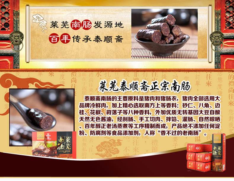 山東萊蕪泰順齋食品有限公司位于萊蕪之重鎮(zhèn)——口鎮(zhèn)(古稱吐絲口鎮(zhèn)),廠址為百年南腸發(fā)祥地。2004年國(guó)營(yíng)口鎮(zhèn)順香齋南腸廠進(jìn)行破產(chǎn)重組, 2007年完成改制,南腸技藝傳承人劉鋒原為順香齋南腸廠領(lǐng)導(dǎo),他帶領(lǐng)原廠部分技術(shù)骨干和下崗職工,購(gòu)得老廠土地使用權(quán)后,在原廠址重新整合,創(chuàng)辦了“山東萊蕪泰順齋食品有限公司”,掀開(kāi)了口鎮(zhèn)南腸發(fā)展的新篇章。